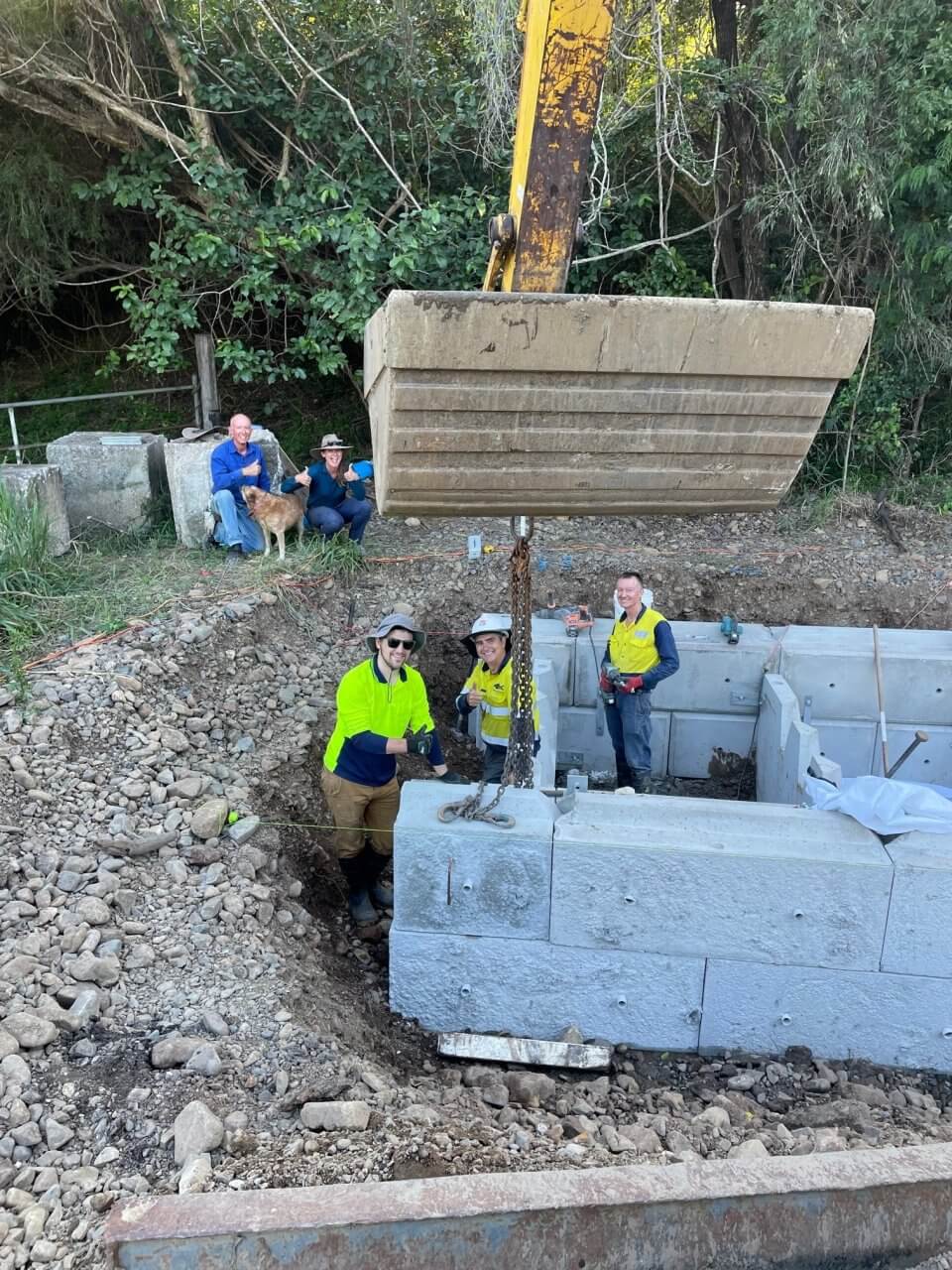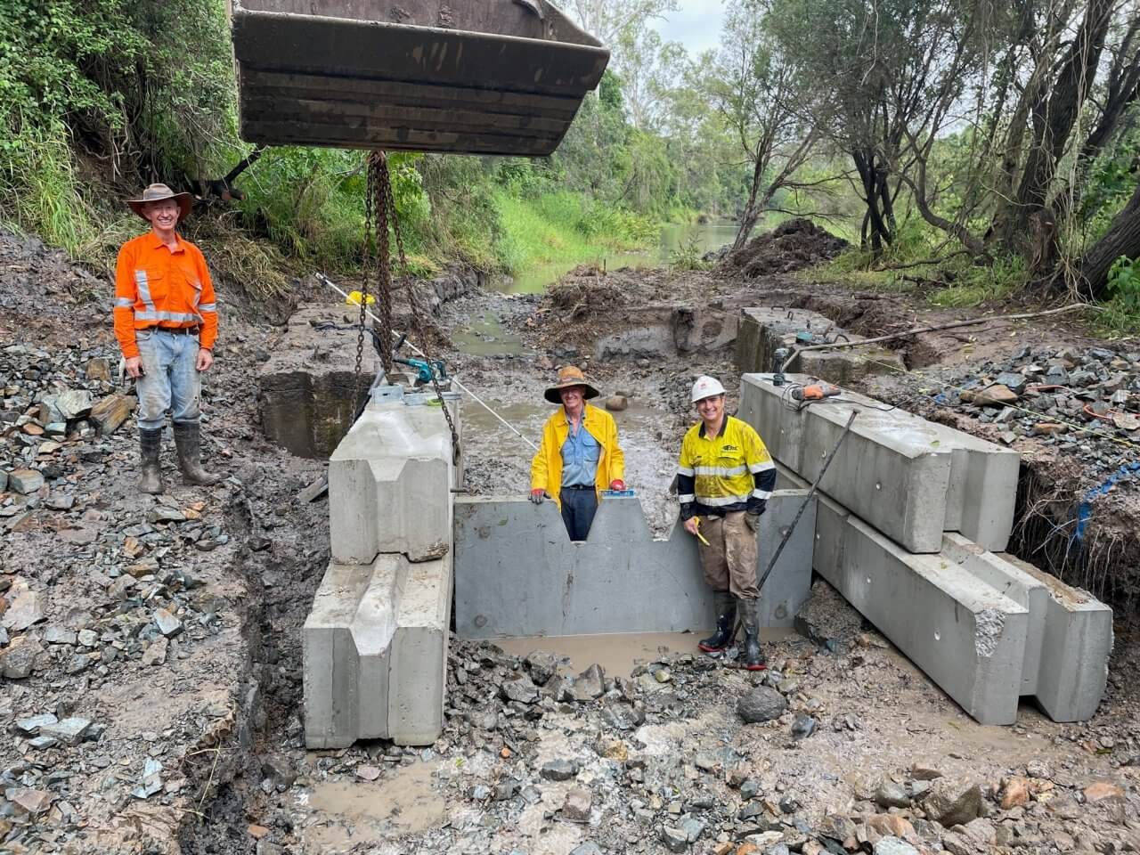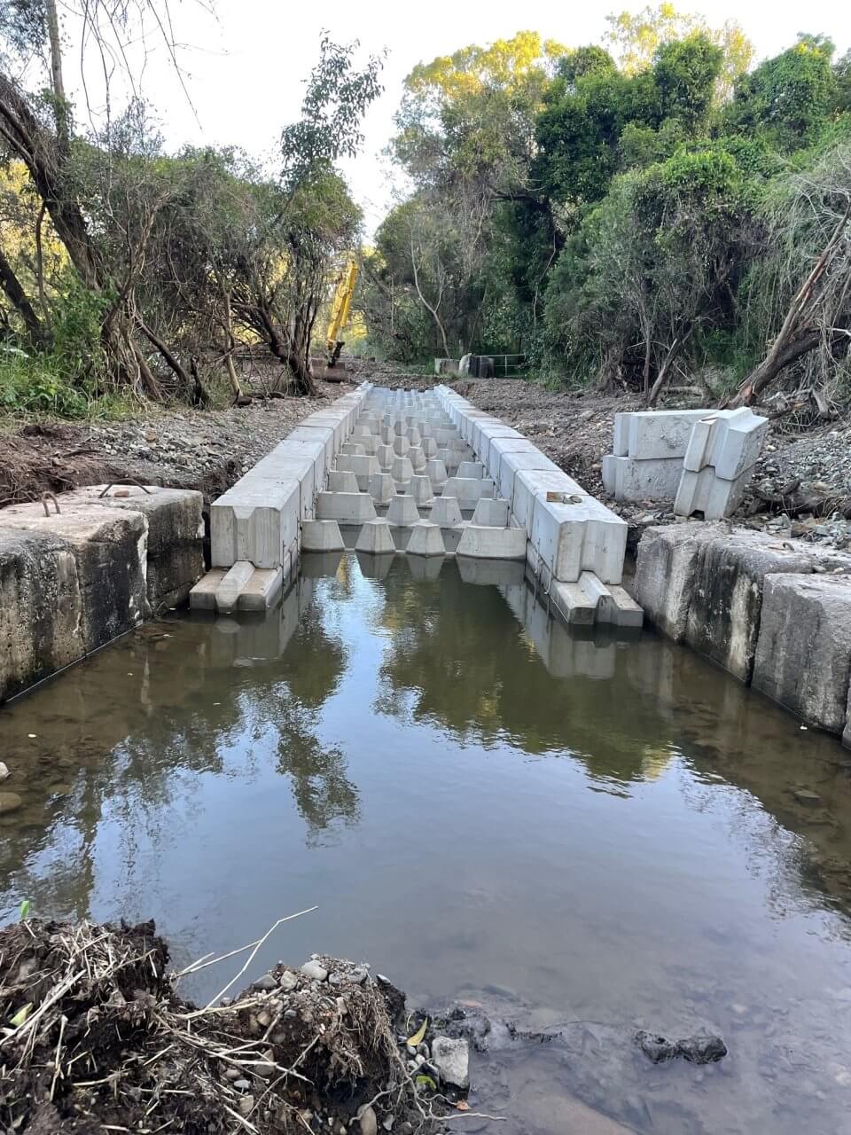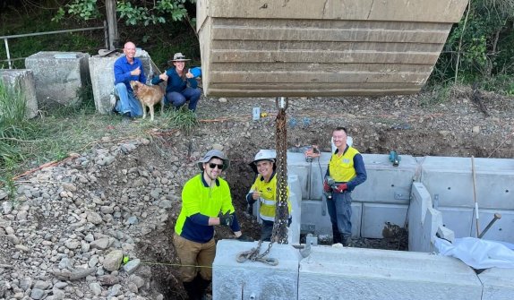 “Our property is on the river where the weir is so our family has been maintaining the weir in this area since around 1967. I personally started doing it in around 2007 when I acquired some machinery which allowed me to rebuild the weir much easier after flood events. I wanted to improve the quality of the upstream waterhole and improve fish passage past the weir. We initially installed a concrete block bywash which handled the environmental flow from the dam, and allowed fish passage on the higher tides. When we got the funding from FBA to improve the fishway it was myself and my brothers Jonathan and Anthony who were on the ground supplying the labour and a lot of the materials. Matt Richie from Holcim Concrete was another big contributor as well, he saw value in what we were doing and discounted over 100 concrete blocks for the project which is amazing. Overall, it was a lot of hard work and a lot of financial expense but the results have been great,” said Michael.
